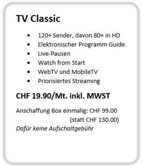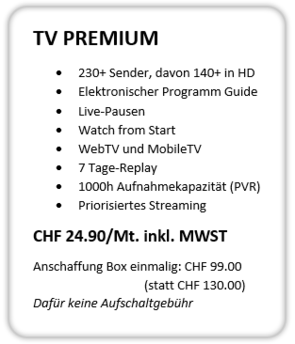 • Die digitale TV-Box im Wert von CHF 130.00 erhalten Sie bei Vertragsabschluss bei uns für nur CHF 99.00